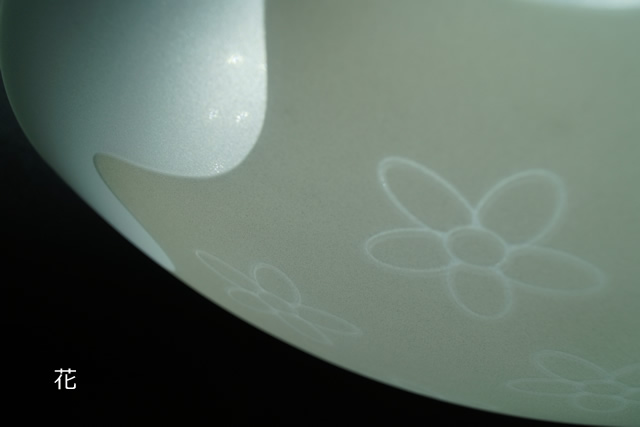 ライトをつけると、光のなかにぼんやりと花の模様が浮かび上がるようになっています。手書きのような花の模様には素朴な雰囲気があり、力が抜けたような魅力があります。
