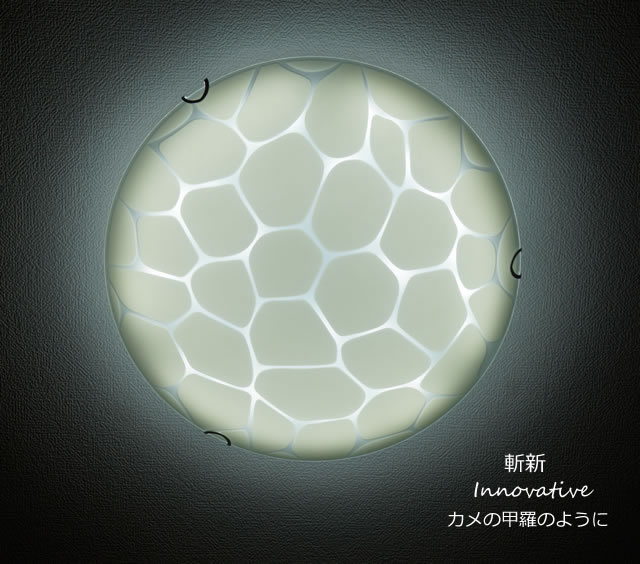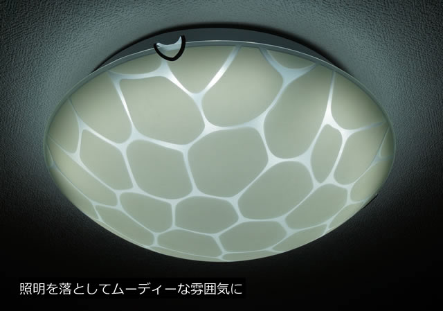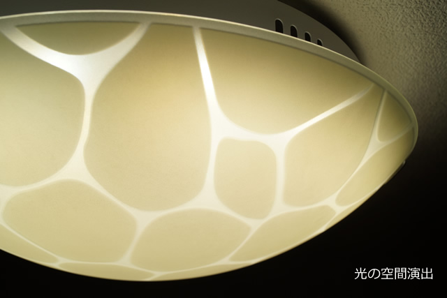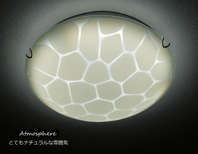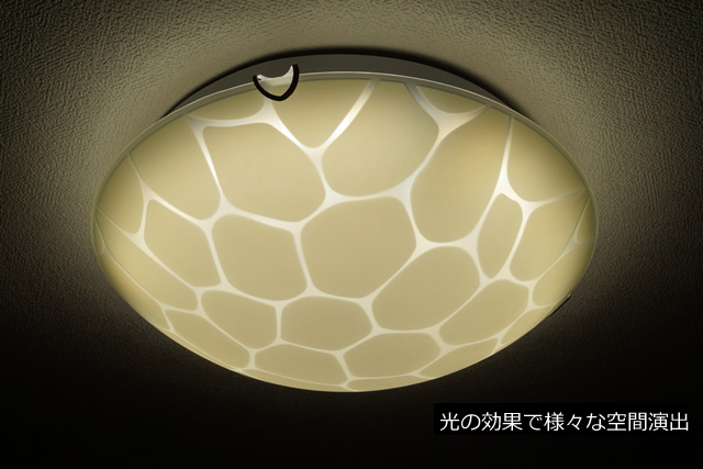 シンプルなラウンド状のシェードの表面に、ジラフパターンや敷き詰めた石を連想させる模様が描かれた、お洒落なシーリングライトです。