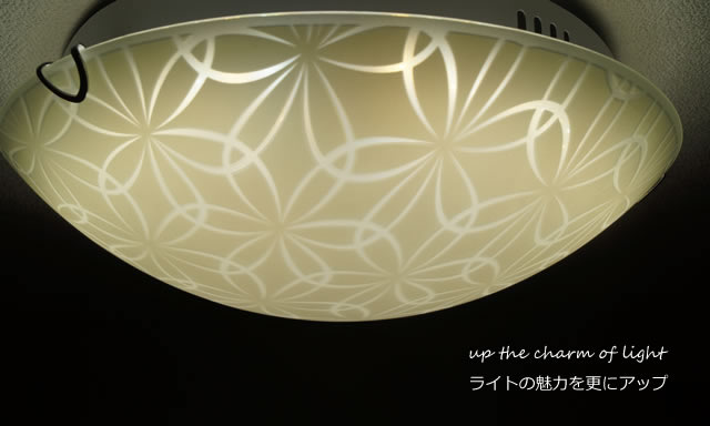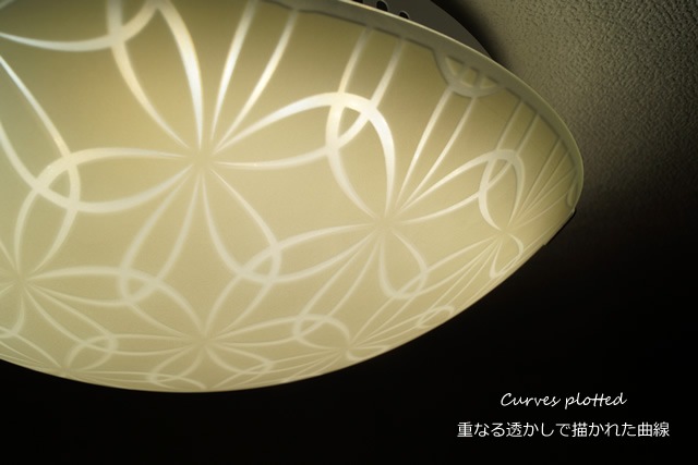 ガラスのシェード部分に花の模様が描かれているLEDシーリングライトです。このライトは半円形をしていますが、そのガラス部分に細い線で描かれている花柄が全面に散りばめられています。少し線が輝いて見えて、綺麗なラインでライトの魅力を更にアップしています。