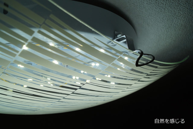 円形のライトを覆うガラスのシェードには、太さや長さの違う線による模様があり、涼しげな雰囲気を出しています。単に線が並んでいるのではなく、シェード全体が5分割されていて、さらに線がいくつも並んでいることでとても複雑な模様に仕上がっています。