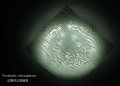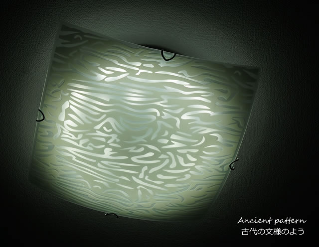 硝子のシェード全体には古代の文様のような模様が広がっていて、神秘的な雰囲気をたたえています。光の透過によって模様が浮かび上がるので、ライトをつけるたびに幻想的な模様が天井に浮かびます。シェードの縁取りによって、全体が引き締められています。