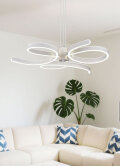 モダン的なデザインの中にナチュラルな趣が感じられる、北欧モダンのペンダントライト モダン的なデザインの中に温もりが感じられる・・・そんな北欧モダンアート風ペンダントライトが登場しました。 一見したところ、照明器具とは思えないほどアーティスティック。 モダン的なデザインですが、風になびくリボンのようなパーツにはナチュラルな趣もあり、ほどよいバランスをキープしています。 天井から真っすぐに下りてくる3本のコードの先にあるのは、小さな円柱型のライト。 そのライトの側面から、3つの大きな輪が、それぞれ3方向に広がっています。 少し太めのテープ状のライトが、ぐるりと円を描きながら、外に向かって広がっていく様子は、リボンが風に吹かれているかのようです。 リゾートホテルで目にするシーリングファンを思わせるデザインですが、こぼれてくるのは風ではなく、優しい光です。 スイッチを入れると、輪を描いている3つのライトの両端が、リボンを縁取るブレードのように輝き、このペンダントライトの全体像がくっきりと浮かび上がります。 中心となっている円柱形の端には丸いビーズのような飾りがアクセントとなっていて、下から見上げると、大輪の花のようでもあります。 明かりを消しているときはモダン的な印象が強く、明かりを付けると、雰囲気が一変。温かみやリラックス効果が感じられます。 3段階の調光が可能なのも嬉しいポイントです。 ベッドルームに飾って、眠りにつく前のひと時を優しく照らしたり、小さなテーブルを照らすように飾って、リラックスしたティータイムを楽しんだり、お気に入りの空間づくりを助けてくれます。