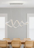 モチーフはオーロラ。北欧テイストのペンダントライト。 北欧の夜空を彩るオーロラからインスピレーションを得てデザインされたペンダントライトをご紹介します。 このライト特徴の一つは、天井からのびるワイヤーが目立たないことです。 遠くから見ると、不思議な形の物体が、宙に浮かんでいるかのように見えます。 真横から見ると、大、中、小、そしてさらに小さな幾何の輪が連なっているように見えますが、よく見ると、一筆書きのように、一つの大きな輪によって形作られている、デザインであることがわかります。 一つの大きな輪が、メビウスの輪のように、ねじられ、ひねられて、自由に動いているかのようなフォルムを生み出しているのです。 ベースとなっている大きな輪は、ほんの少し厚みのある帯状で、スイッチを入れると、表面だけが光り輝くようになっています。 輪がねじられ、ひねられることによって、光り輝く面と、影となる面が交互に現れ、空中人不思議な光の物体を浮かび上がらせます。 帯の動きは流れるように自由で、オーロラが少しずつ形を変えながら動いているようです。 見る方向によって、違った形に見えるのも、このペンダントライトの面白さです。 3色の調節が可能なので、色あいの微妙な違いを楽しむことができます。 スイッチをオフにしている時も、デザインそのものを楽しめるので、ペンダントライトというより、アート作品と思ってもよいでしょう。 自然をモチーフとした北欧アートをお好きな方や、個性的なオブジェを探している方に是非おすすめしたい逸品です。